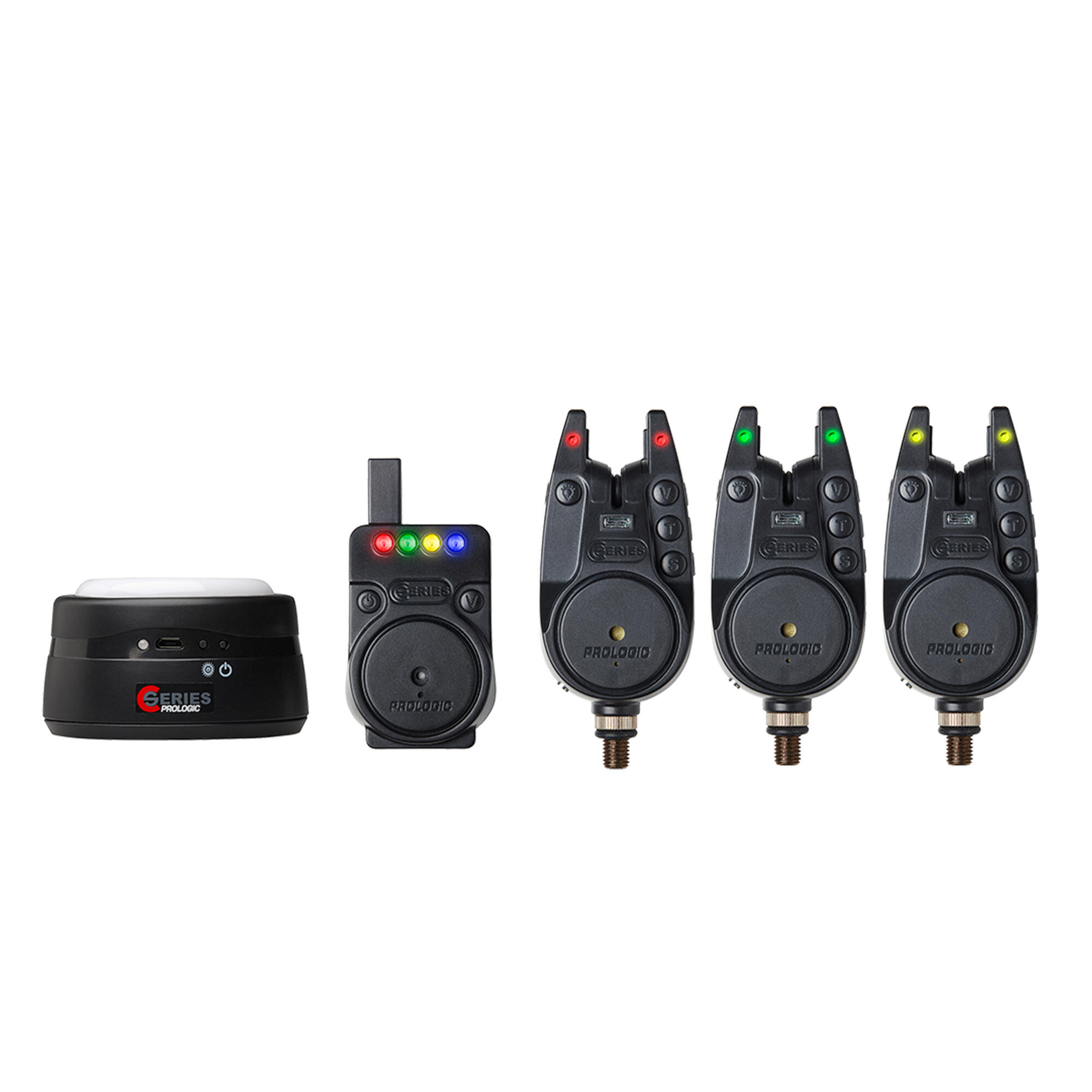 Komplettset aus 3 Bissanzeigern Prologic C-Series Alarm (rot, gelb, grün), Funkbox (100 m Reichweite) und Biwylampe.
