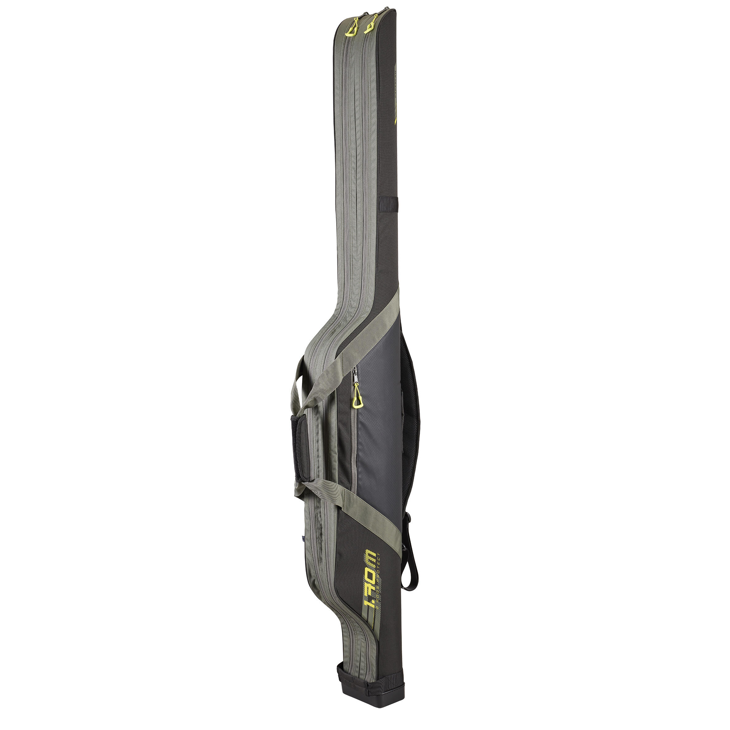 – 2 gepolsterte Schlitze zur Aufnahme von je 1 Rute von maximal 3,30 m (1,65 m Transportmaß) in 2 Teilen. 3000er-Rollen können auf der Rute montiert bleiben, solange die Handkurbel zurückgeklappt ist.