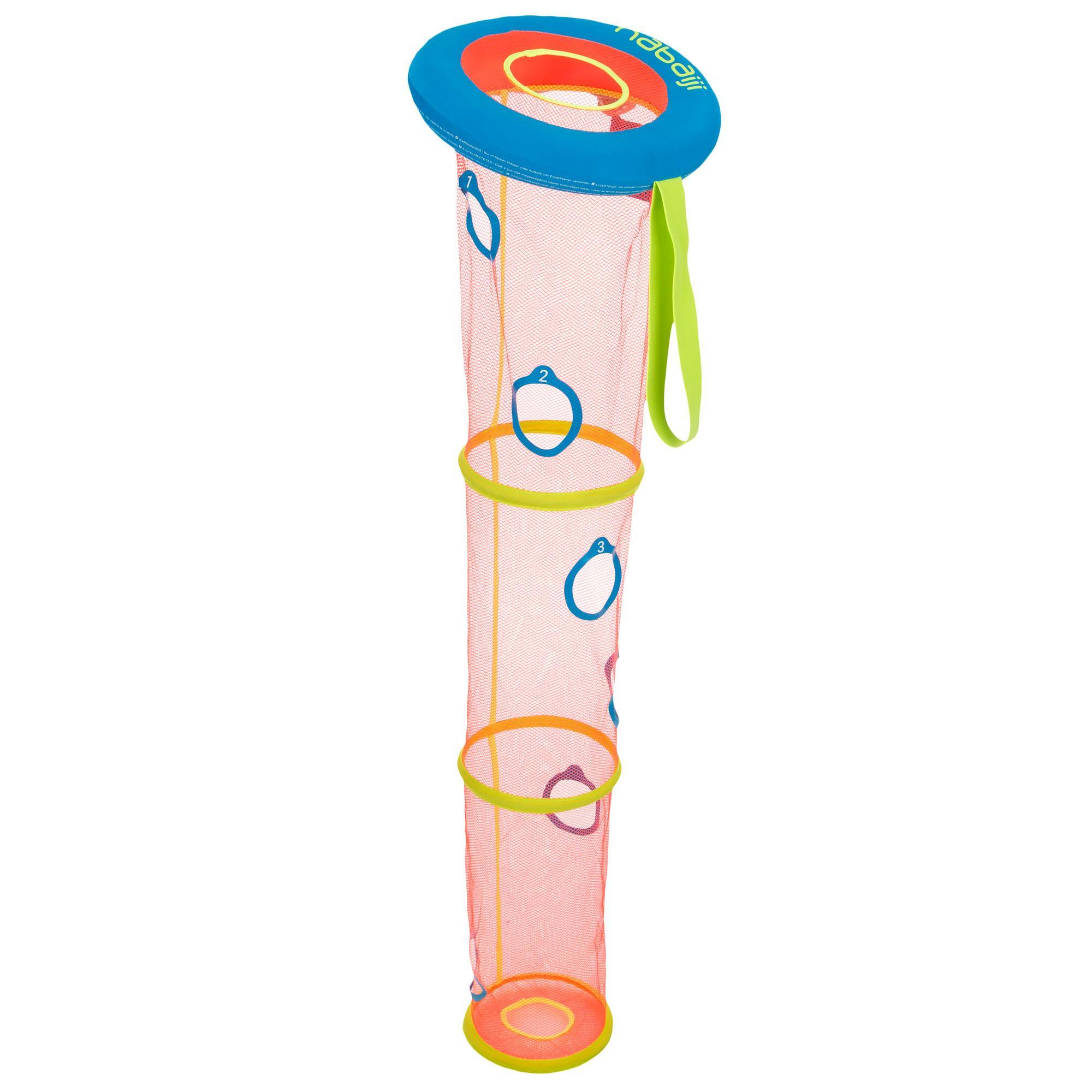 Das Kind nimmt den Ball und muss innerhalb von 30 Sekunden so viele Punkte wie möglich erzielen. |Das Kind bringt den Ball in das erste Zielloch und kommt an die Wasseroberfläche zurück. Dann taucht es wieder unter Wasser und steckt den Ball in das zweite Zielloch usw., bis zu dem tiefsten Zielloch, das es erreichen kann.